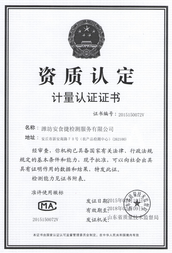 2015年2月,魯豐集團組建的第三方檢測中心——濰坊安食捷檢測服務(wù)有限公司獲省質(zhì)監局計量認證,是該公司繼中國合格評定認可委員CNAS認可后的榮獲的又一資質(zhì)。